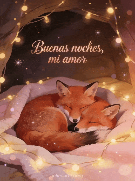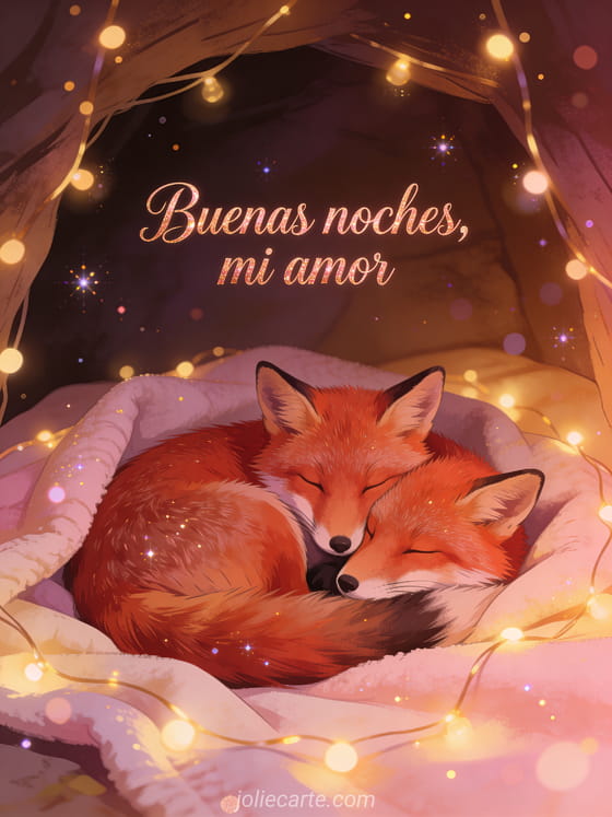 Envía un romántico deseo de buenas noches al amor de tu vida con esta hermosa tarjeta gratis. Una pareja de zorros acurrucados bajo lucecitas de hada, perfecta para una noche tierna. Descubre también una tarjeta te amo buenas noches mi amor o una tarjeta buenas noches te amo mi amor gif.