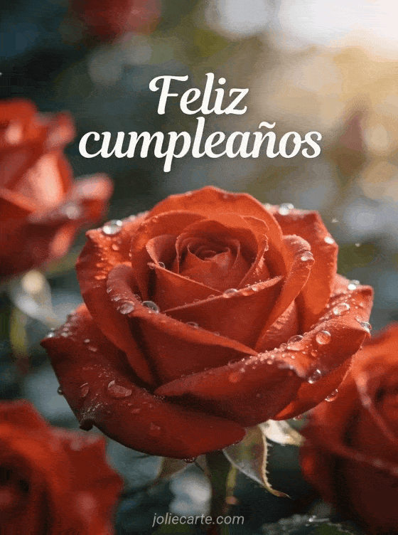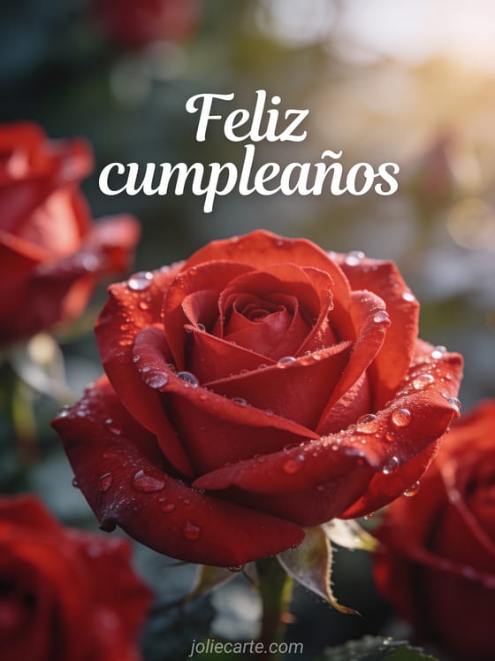 Compartan esta tarjeta fotorrealista macro con rosas rojas, gotas de rocío y luz suave de la mañana. También pueden ver imagen feliz cumpleaños mujer gratis, gif humor cumpleaños mujer y feliz cumpleaños mujer texto.