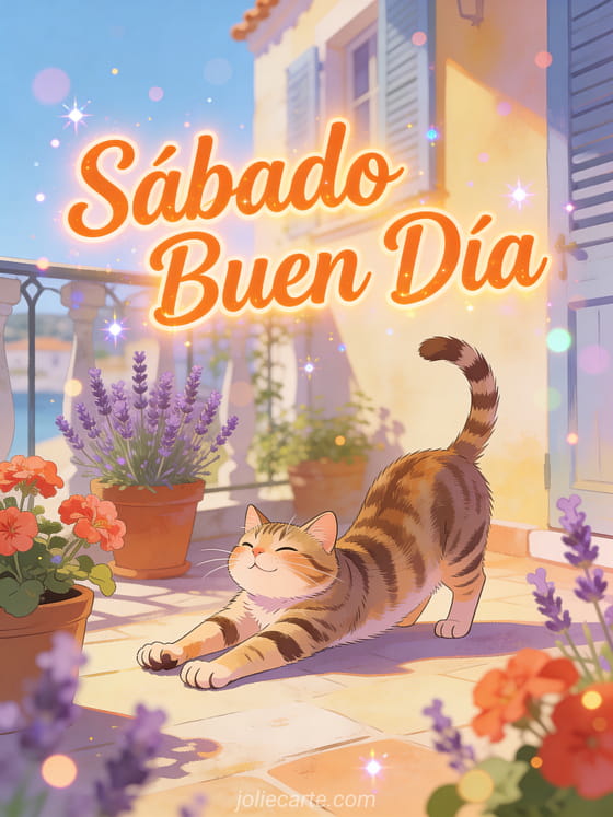 Desea a alguien un sábado maravilloso con esta alegre tarjeta con un gato atigrado. Descubre también una tarjeta feliz sábado y buen fin de semana o una tarjeta feliz sábado soleado besos.