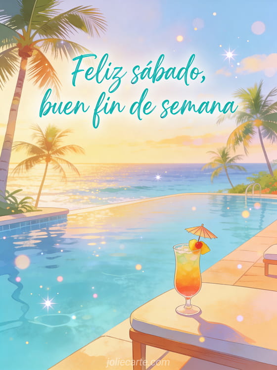 Comparte un saludo soleado de feliz sábado y buen fin de semana con una hermosa piscina infinita frente al océano tropical, palmeras y un cóctel exótico. Descubre también buenos días feliz sábado imágenes, feliz sábado calentito o buenos días buen día feliz sábado.