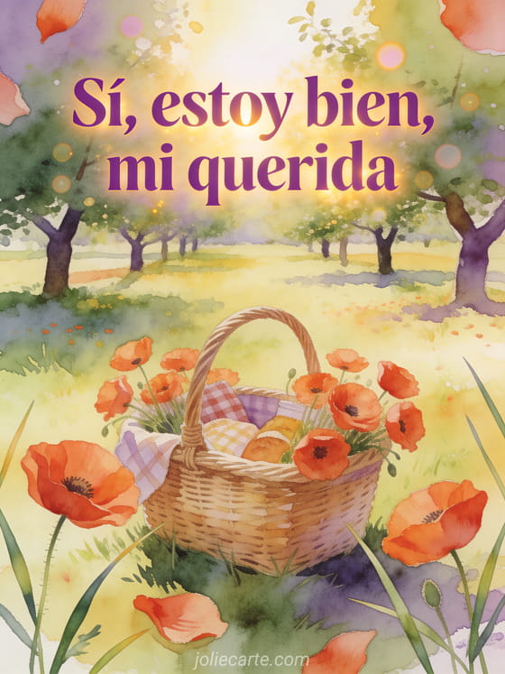 Responde con calma y cariño mediante letras violetas en acuarela, amapolas, una cesta de picnic en un claro soleado de huerto, bokeh apacible y luz dorada. Descubre también una tarjeta de cómo está mi hija, una tarjeta de hola amigos cómo están o una tarjeta de cómo está mi nieto.