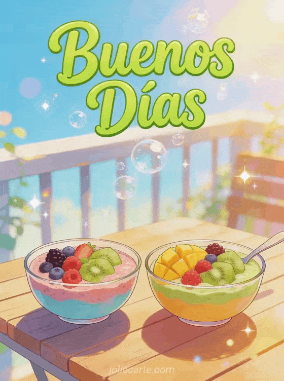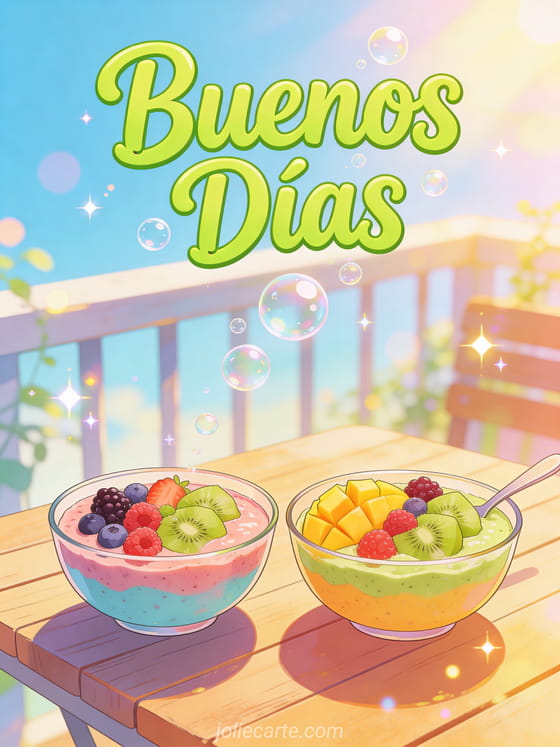 Sms buenos días amistoso un fresco y enérgico saludo matutino con coloridos smoothie bowls y frutas en una terraza soleada
