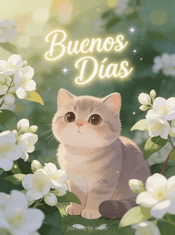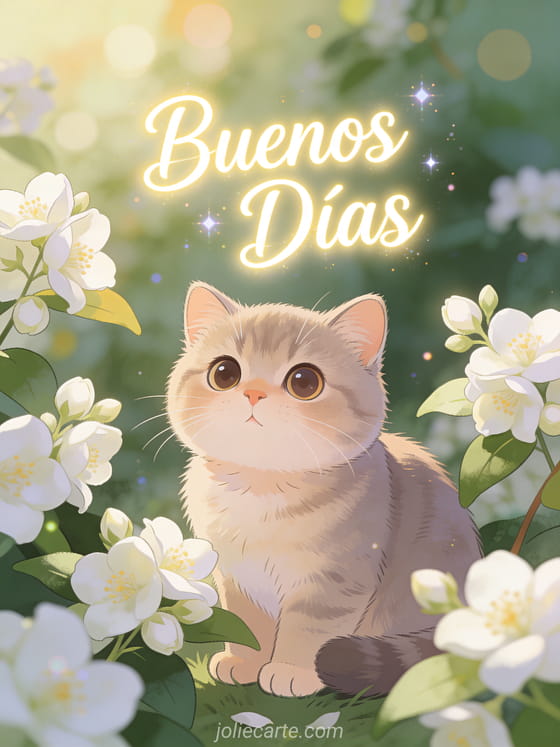 Una dulce e irresistible tarjeta de buenos días con un adorable gato british shorthair de ojos redondos entre flores de jazmín blanco en un jardín romántico. Descubre también una buenos días tarjeta, un buenos días gif animado o un mensaje buenos días madrugador.