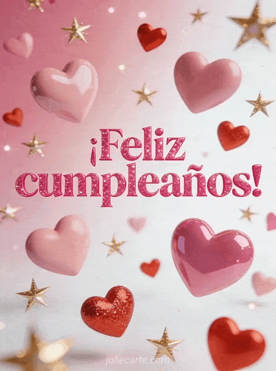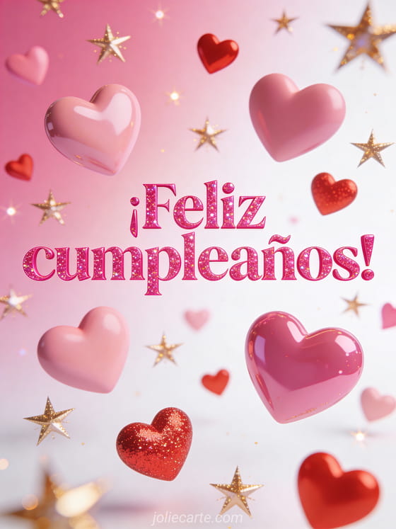 Envía una alegre tarjeta de cumpleaños con letras rosas brillantes con efecto brillante, corazones rosas y rojos de distintos tamaños flotando entre estrellas doradas centelleantes sobre fondo rosa degradado. Descubre también feliz cumpleaños mujer con gato o texto tarjeta cumpleaños mujer.