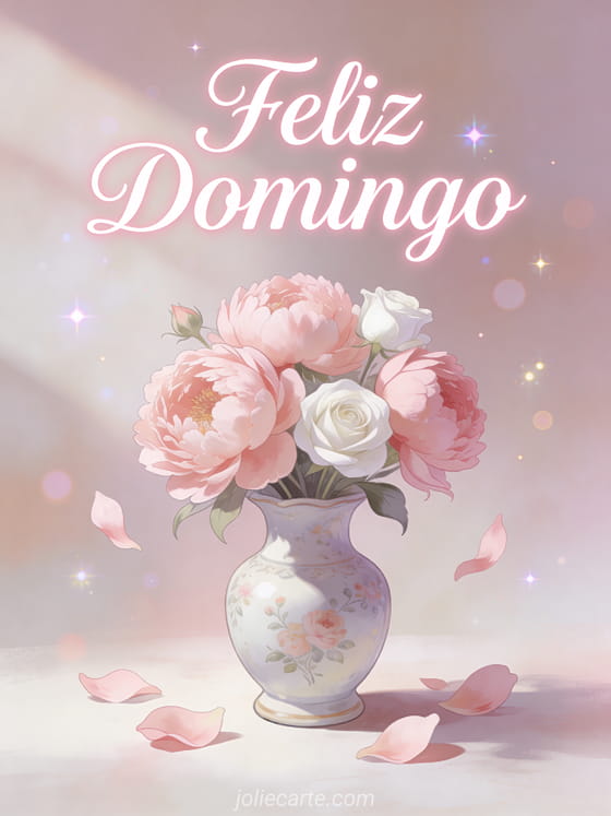 Comparte romanticismo con esta tarjeta de feliz domingo con un delicado arreglo de peonías rosas y rosas blancas en un jarrón de porcelana vintage con suave luz de la mañana. Descubre también una tarjeta de fotos para desear un feliz domingo o de feliz domingo relax.