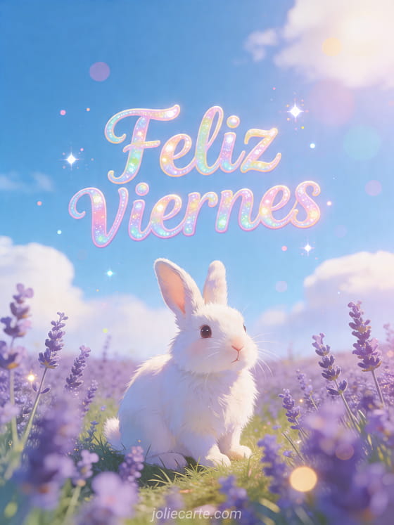 Comparte esta alegre tarjeta de feliz viernes con un conejito blanco entre flores de lavanda y sol brillante. También pueden descubrir linda noche de viernes, positivo hola viernes y feliz viernes café.