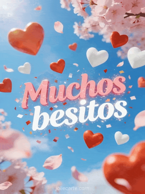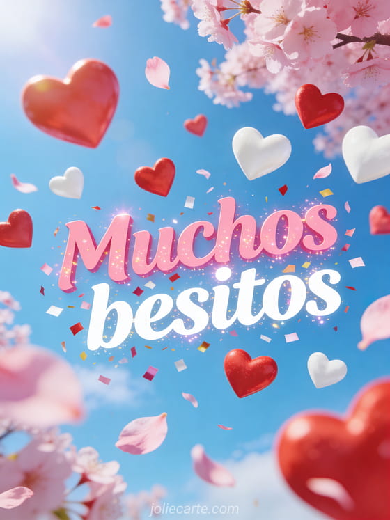 Envía muchos besitos con esta alegre tarjeta llena de corazones rosas y pétalos de cerezo girando en un cielo de primavera. Descubre también besitos bien mojados o dibujo chica besitos.