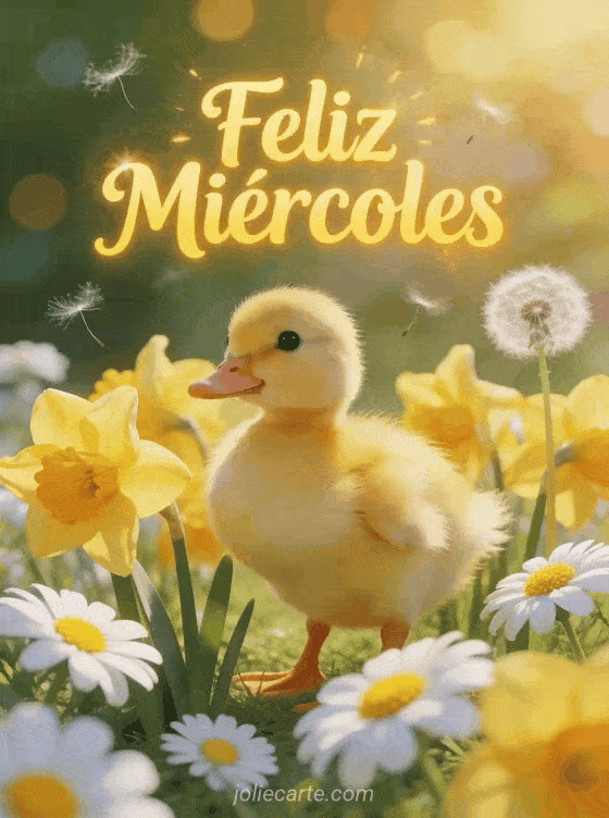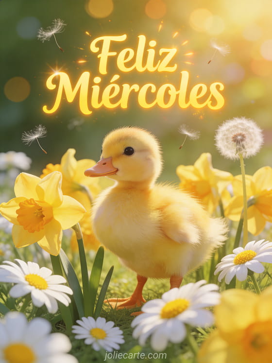 Comparte un alegre deseo de feliz miércoles con esta adorable tarjeta con un patito entre narcisos amarillos y margaritas. Descubre también imagen feliz miércoles amigos o imágenes buenas tardes de miércoles para más inspiración.