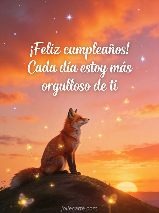 Comparte una tarjeta conmovedora de cumpleaños para tu hijo con un zorro rojo sentado en una colina al atardecer, cielo naranja y rosa, primeras estrellas y luciérnagas. Descubre también una tarjeta de cumpleaños mi hijo, una cumpleaños hijo o una feliz cumpleaños mi hijo.
