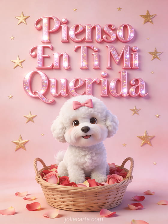 Envía esta adorable tarjeta con un lindo perrito bichón frisé blanco con un moño rosa en una canasta de pétalos de rosa. Descubre también una tarjeta pienso en ti mi amor o una tarjeta corazón pienso en ti.