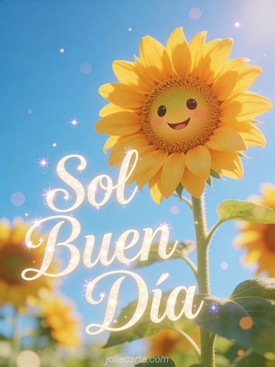 Ilumina el día de tus seres queridos con esta radiante tarjeta con un alegre girasol sonriente bajo un cielo azul brillante, irradiando calidez y felicidad. Descubre también una tarjeta de buen día con besos o una tarjeta de buenos días y buen día.
