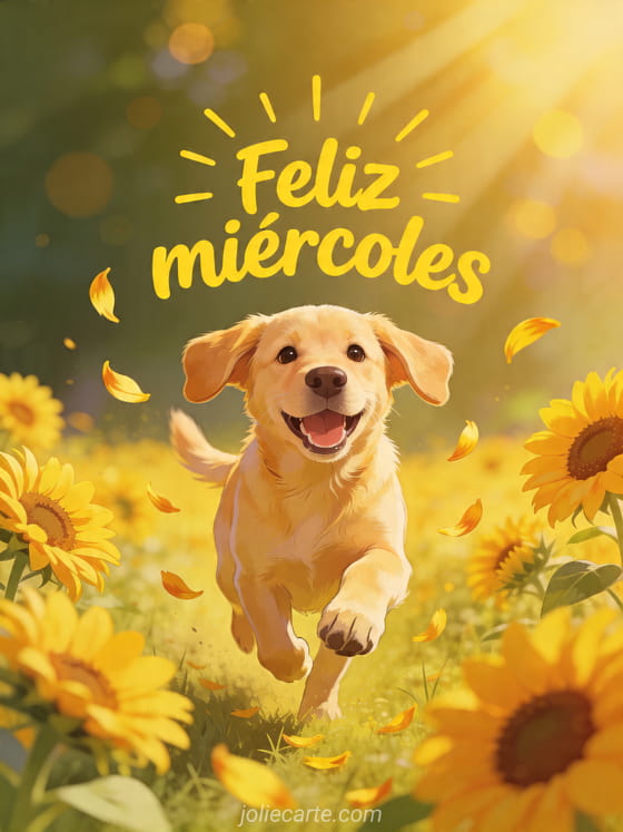 Comparte un feliz miércoles lleno de alegría con esta tarjeta luminosa de un labrador sonriente entre girasoles. Descubre también imagen miércoles lluvioso, foto buenos días feliz miércoles o miércoles miércoles imagen buenos días y buen día.
