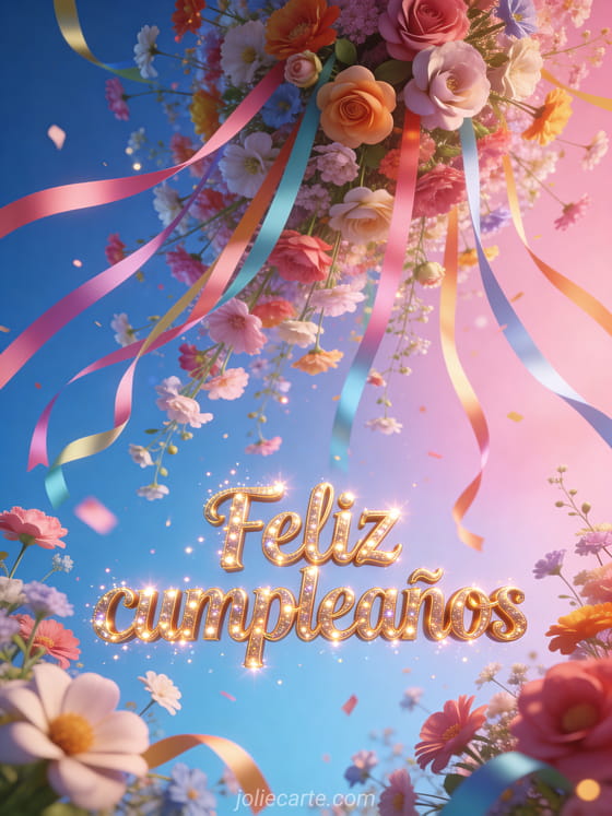 Envía esta alegre tarjeta animada de cumpleaños con letras doradas brillantes y una cascada de flores y cintas de colores cayendo del cielo en estilo 3D festivo. Una tarjeta gratuita para su día especial. Descubre también tarjeta de cumpleaños elegante para mujer o mensaje de cumpleaños para mujer.