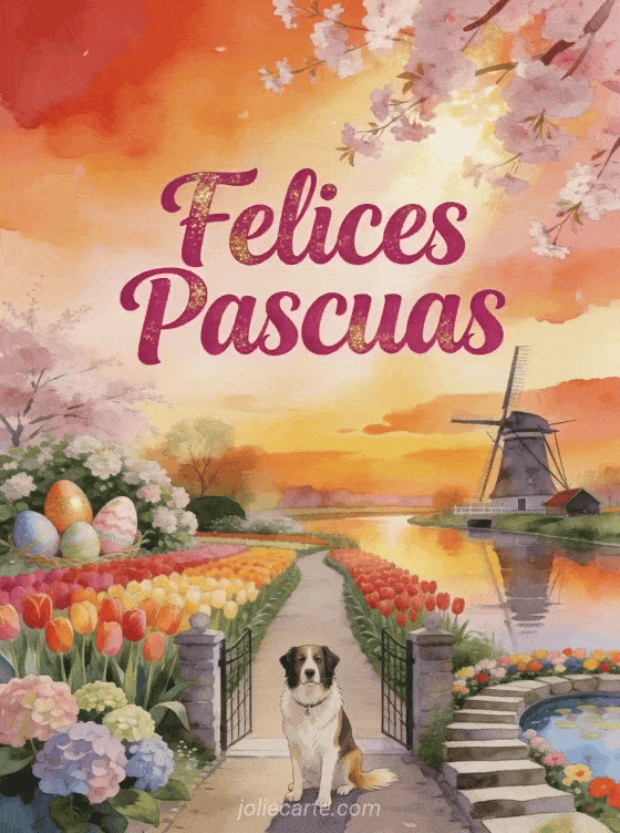 Celebra la Pascua con esta encantadora tarjeta animada gratuita con un pastor australiano en la entrada de un camino del jardín de Keukenhof con tulipanes en tonos de atardecer, un molino holandés reflejado en un canal y huevos de Pascua entre hortensias. Descubre también cartes virtuelles joyeuses paques gifs joyeuses paques.
