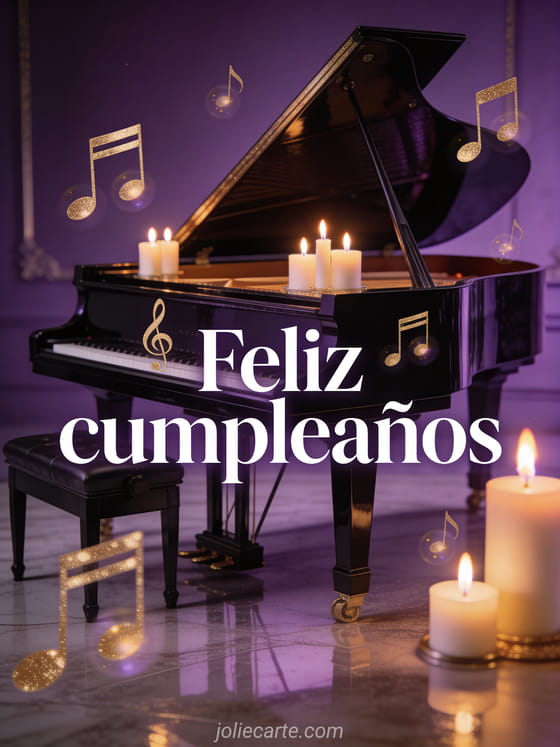 Envía esta refinada tarjeta animada gratuita musical de cumpleaños con notas musicales doradas flotando alrededor de un piano de cola negro lacado con velas encendidas. Descubre también un cumpleaños gif animado o una tarjeta de cumpleaños animada gratis.