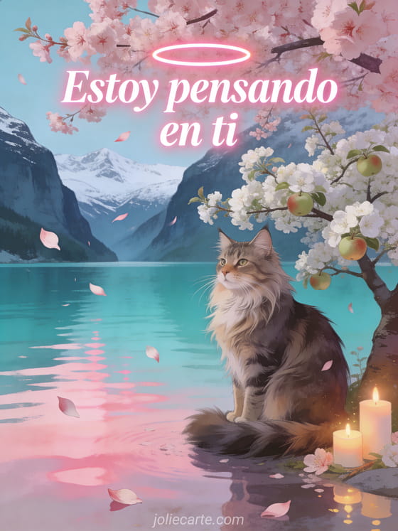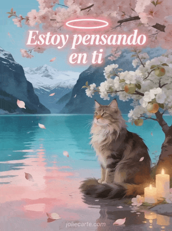 Comparte esta hermosa tarjeta animada pienso en ti con cerezos en flor sobre un fiordo turquesa y un majestuoso gato Maine Coon. Descubre también una tarjeta pienso mucho en ti o imagen gratis pienso en ti.