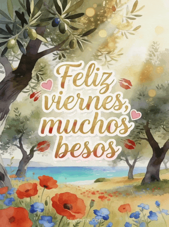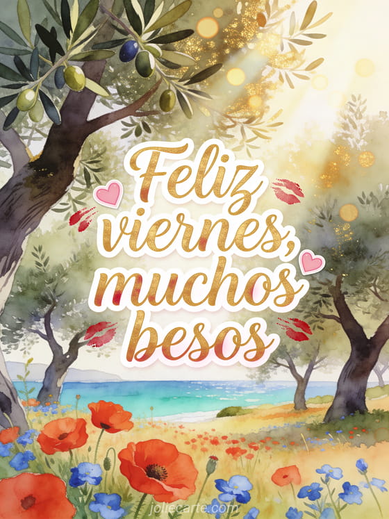 Envía un feliz viernes con letras cursivas doradas, corazones rosas, marcas de besos rojos y un olivar griego soleado con amapolas, acianos y el mar turquesa a lo lejos. También pueden ver esta cyber tarjeta feliz viernes, esta buenos días feliz viernes por la mañana o estas bellas imágenes para desear un feliz viernes.