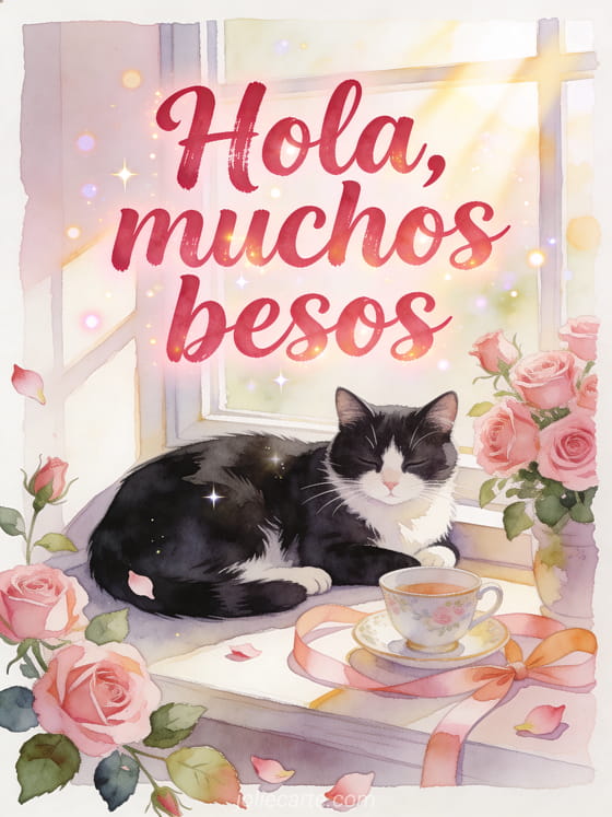 Comparte un hola cálido con letras rojo rosa en acuarela, un gato blanco y negro junto a una ventana luminosa, rosas rosadas, una taza de porcelana, cintas y rayos de sol. Descubre también una tarjeta de hola vida, una tarjeta de hola conejito o una tarjeta de mañana un saludito besos.