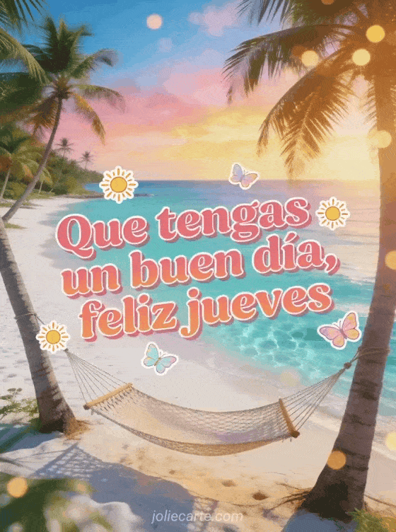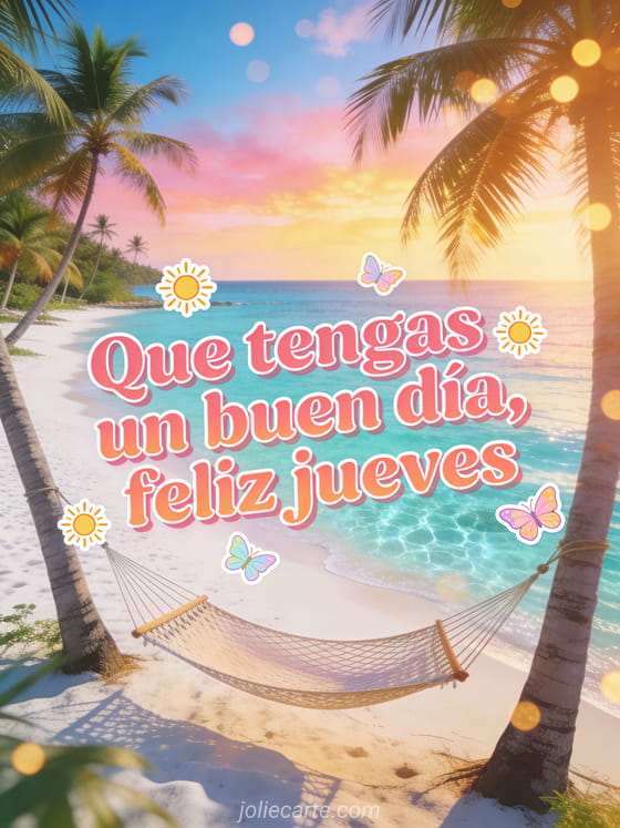 Envía una tarjeta buen día jueves con letras redondas rosa coral, pequeños soles, mariposas pastel y una playa de arena blanca bordeada de palmeras. Comparte un deseo cálido entre semana y descubre también feliz jueves mensaje, feliz jueves cita positiva o feliz jueves amiga mía.