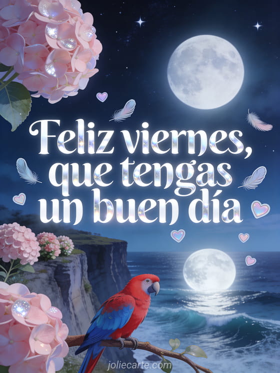 Envía una tarjeta buen día viernes con letras blancas elegantes, reflejos plateados, corazones pastel y un acantilado costero bajo la luna sobre el océano. Comparte un deseo poético de fin de semana y descubre también cita zen feliz viernes, feliz viernes y buen fin de semana o imagen de feliz viernes besos.