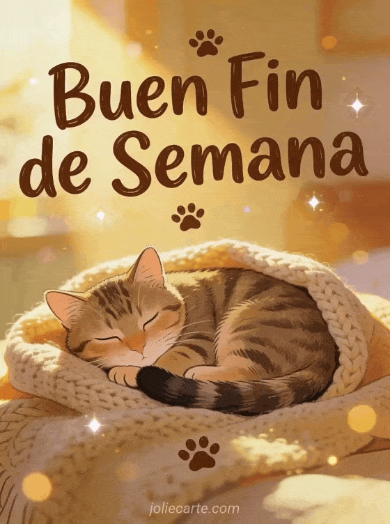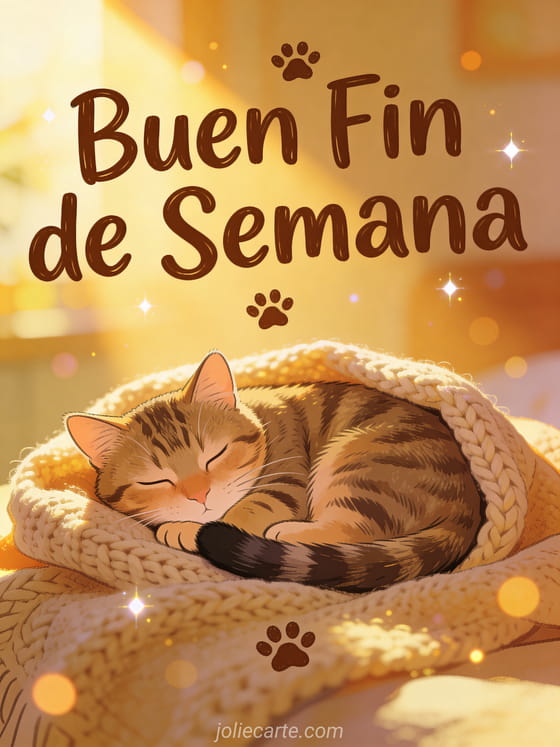Envía una tarjeta de buen fin de semana con un gato y comparte un ambiente acogedor. Un gato atigrado dormilón acurrucado en una manta suave bajo el sol de la tarde es el deseo perfecto de descanso. Descubre también una tarjeta buen fin de semana o buenas vacaciones o una tarjeta buen fin de semana a todos humor.