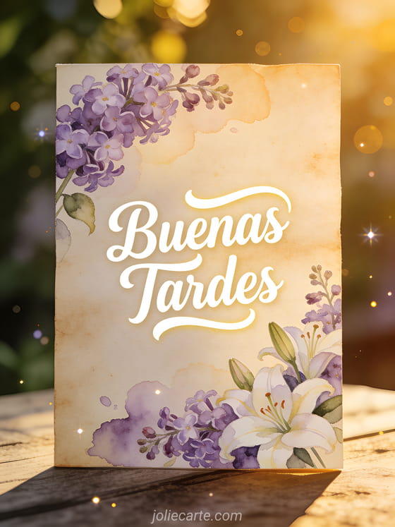 Comparte elegancia con esta tarjeta de buenas tardes con un hermoso borde floral en acuarela de lilas y lirios sobre papel vintage. Descubre también una tarjeta de deseándoles una buena tarde o de gif buenas tardes soleado.