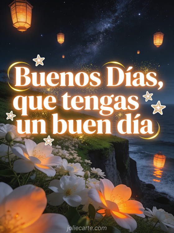 Comienza el día con esta encantadora tarjeta con flores blancas sobre un acantilado verde frente al océano, linternas flotantes en un cielo estrellado y la Vía Láctea. Descubre también una tarjeta de buenos días con sol o una tarjeta de buen día con besos.