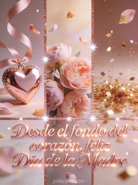 Comparte una tarjeta con corazón para el Día de la Madre con un adorno pulido, peonías rosadas, cintas de seda y confeti dorado. Descubre también un poema de amor para el Día de las Madres, feliz Día de la Madre o Feliz Día de las Madres mamá querida.