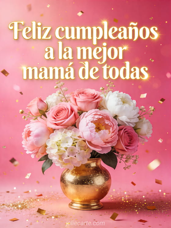 Celebra a mamá con esta elegante tarjeta de cumpleaños con rosas rosas, peonías blancas, hortensias y confeti dorado sobre un fondo rosa festivo. También puedes descubrir una corazón corazón feliz cumpleaños mamá, una tarjeta de felicitación cumpleaños mamá o una feliz cumpleaños mamá.