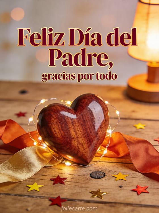 Envíen una tarjeta corazón del Día del Padre con letras rubí profundo, brillo dorado cálido y una escultura de corazón en madera pulida rodeada de pequeñas luces, cinta doblada y confeti brillante sobre una mesa texturizada. También pueden descubrir feliz día del padre a mi hijo, feliz día del padre a todos los papás o Día del Padre te extraño.
