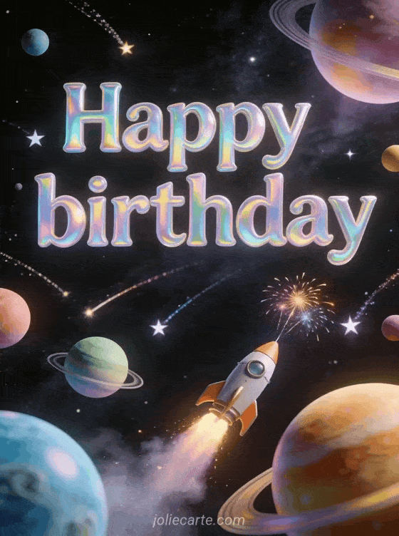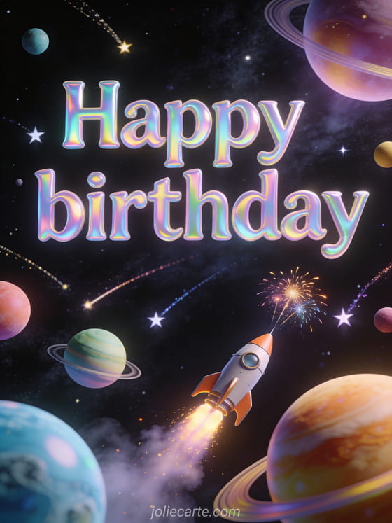 Dale a un adolescente una tarjeta de cumpleaños fuera de este mundo. Letras holográficas irisadas sobre fondo negro estrellado, planetas de colores, un cohete retro y estrellas fugaces crean una atmósfera espacial soñadora. Descubre también un mensaje cumpleaños para adolescentes o una feliz cumpleaños adolescente chica.