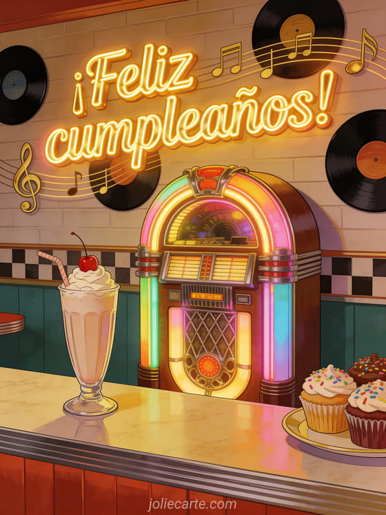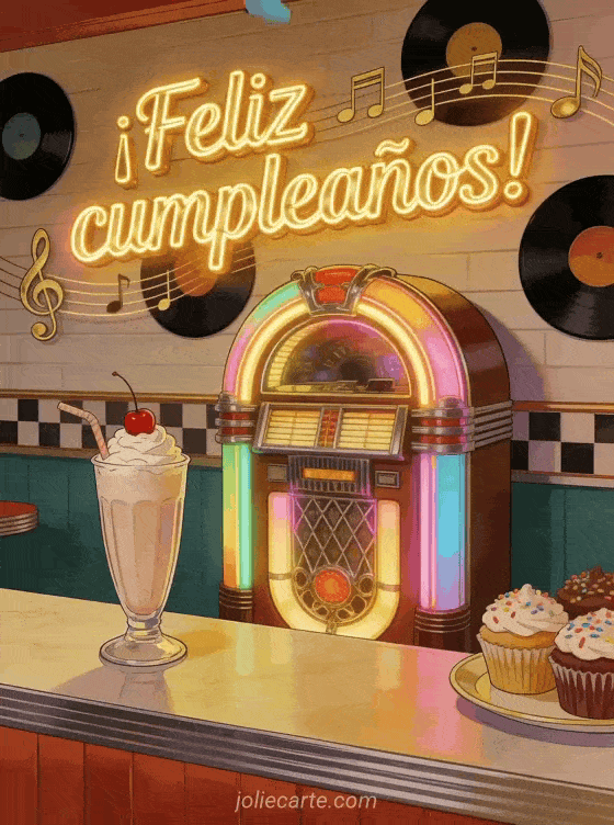 Envía una animada tarjeta de cumpleaños con un jukebox retro, vinilos y cupcakes en un diner americano vintage. Descubra también tarjeta cumpleaños animada musical gratis o feliz cumpleaños animado.