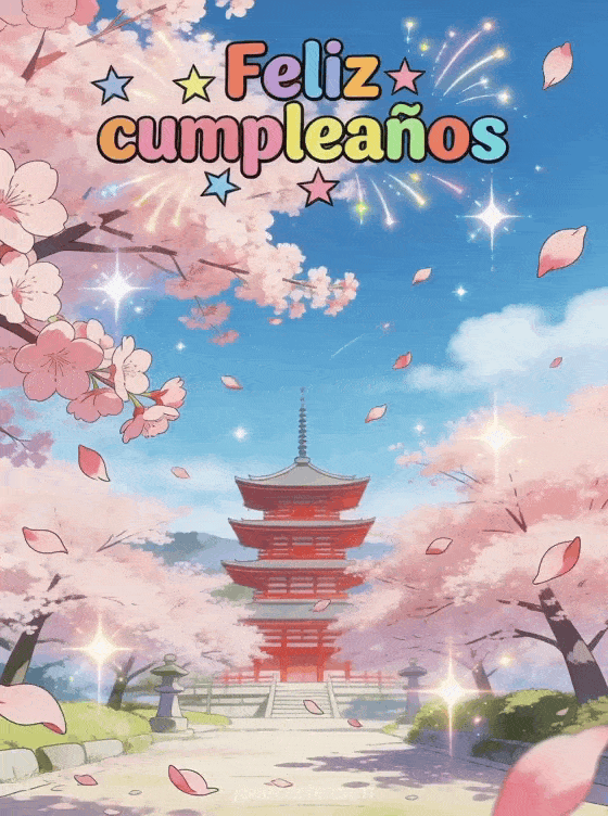 Celebra con una tarjeta animada de cumpleaños inspirada en Japón, con cerezos en flor, pétalos volando y un templo rojo al fondo. Descubre también imagen animada feliz cumpleaños, cumpleaños animado y cumpleaños imágenes animadas.