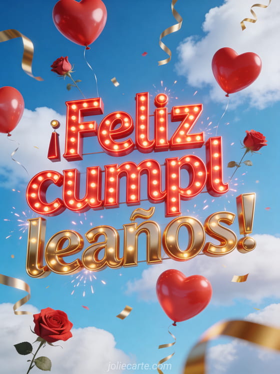 Envía esta festiva tarjeta de cumpleaños gif animado con globos en forma de corazón rojos y rosas, cintas doradas y un ambiente alegre. Descubre también el feliz cumpleaños gif animado para mujeres o el feliz cumpleaños animado ramo de flores.