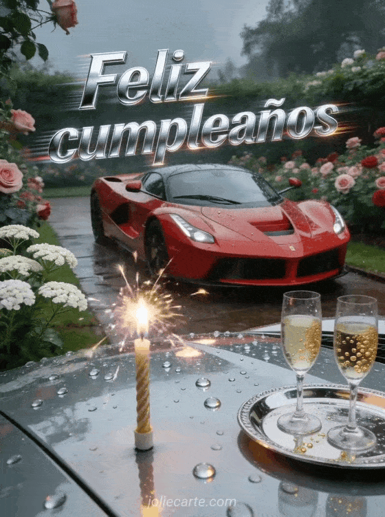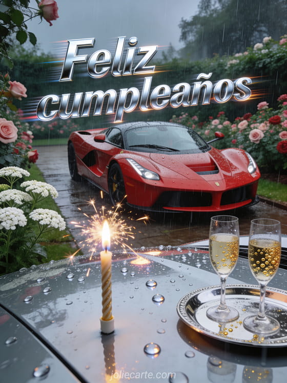 Envía esta dinámica y elegante tarjeta de cumpleaños con un llamativo auto deportivo rojo en un jardín de rosas bajo una suave lluvia, con una bengala mágica en el capó y copas de champán dorado. Una tarjeta ilustrada para los amantes de los autos. Descubre también tarjeta de cumpleaños gratis para hombre o deseos de cumpleaños para hombre.