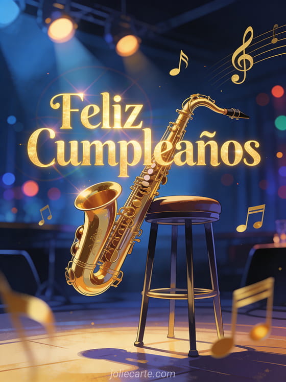Celebra un cumpleaños con esta elegante tarjeta que muestra un saxofón dorado sobre un taburete en un club de jazz, iluminación azul tenue, focos cálidos, notas musicales doradas flotando en el aire y bokeh colorido. Descubre también una tarjeta de cumpleaños romántica o una tarjeta de cumpleaños animada musical.