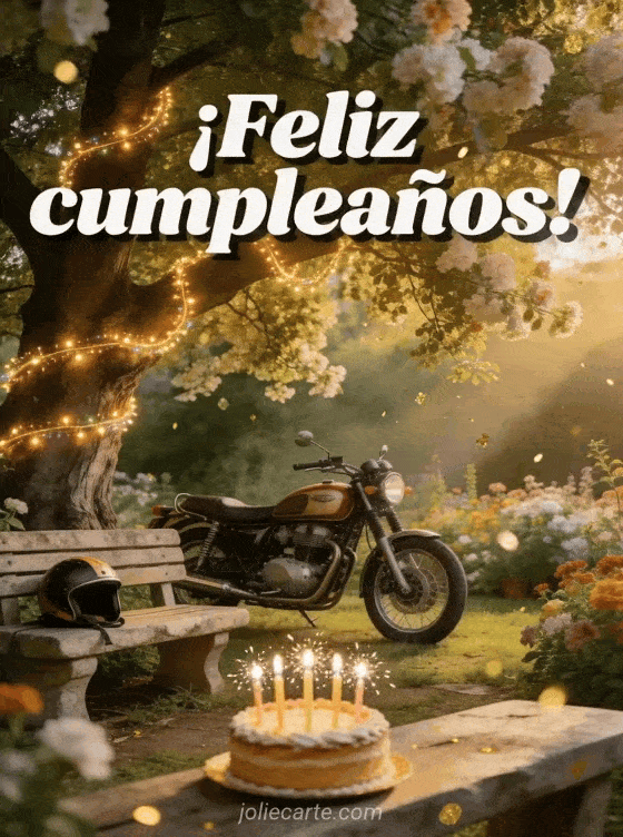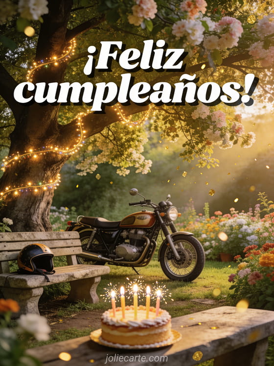 Comparte esta encantadora tarjeta de cumpleaños para el amante de las motos, con una moto vintage en un jardín florecido. Descubre también una imágenes animadas feliz cumpleaños hombre o una gif feliz cumpleaños hombre gracioso.