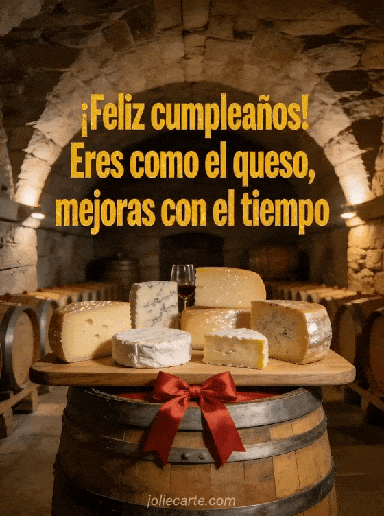 Compartan esta tarjeta fotorrealista con tabla de quesos, barrica de vino y moño de regalo para un brindis divertido. También pueden ver humor frase cumpleaños, imágenes cumpleaños humor hombre y mensaje cumpleaños gracioso.