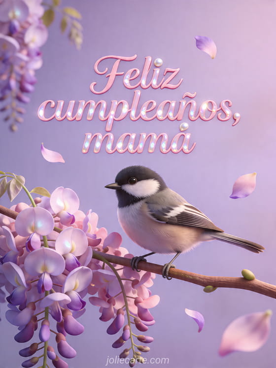 Comparte un dulce deseo de cumpleaños para tu mamá con esta tierna tarjeta de un pequeño herrerillo sobre una rama de glicina en flor con pétalos cayendo. Descubre también feliz cumpleaños mamá, texto cumpleaños mamá conmovedor y dibujo cumpleaños mamá.