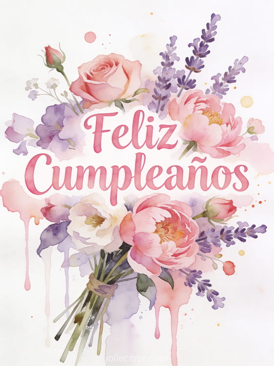 Sorprende a una mujer especial con esta tarjeta de cumpleaños pintada en acuarela, con rosas, peonías y lavanda en tonos pastel. Descubre también una tarjeta de cumpleaños mujer con flores, una tarjeta de feliz cumpleaños mujer graciosa o una imagen de feliz cumpleaños mujer con flores.