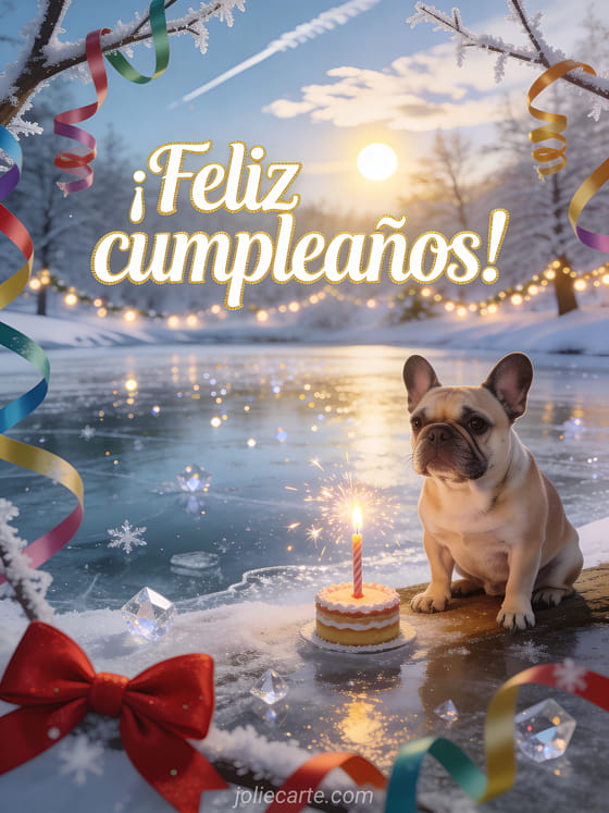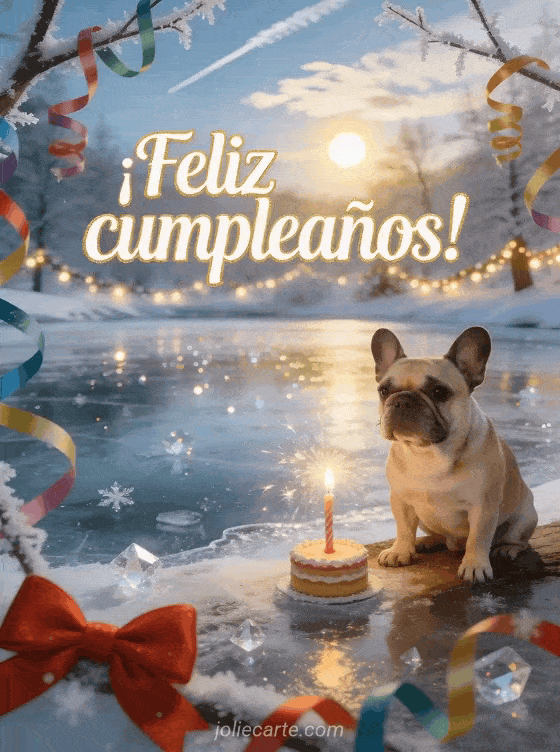 Tarjeta cumpleaños mujer con perro una festiva tarjeta de cumpleaños para mujer con un adorable bulldog francés junto a un resplandeciente estanque helado