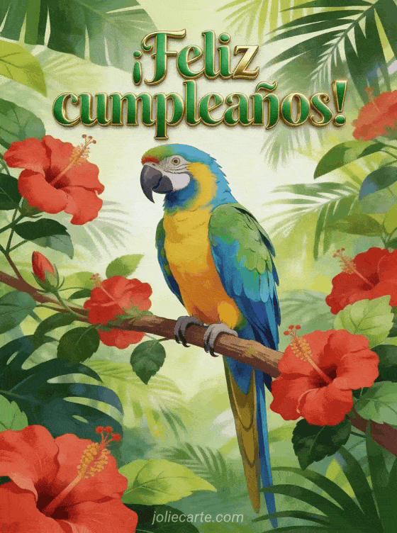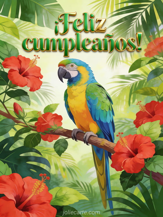 Envía una tarjeta de cumpleaños vibrante con un loro ara multicolor posado en una rama tropical con flores de hibisco. Descubre también palabras de cumpleaños para mujer o un mensaje de cumpleaños para mujer.