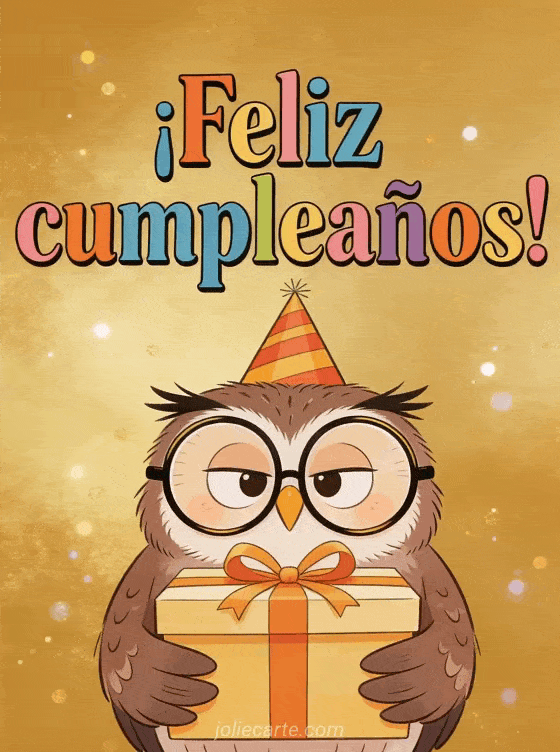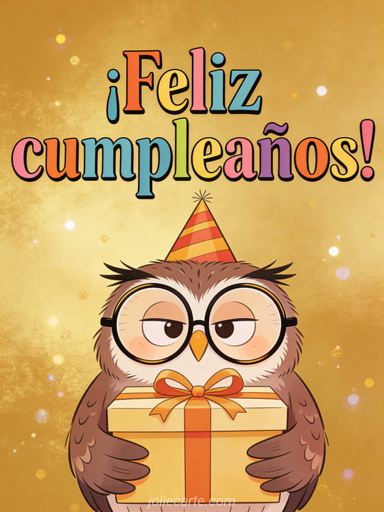 Envía una tarjeta de cumpleaños graciosa con una lechuza con grandes gafas redondas y un gorrito de fiesta sosteniendo un regalo. Descubre también un mensaje para cumpleaños de mujer o una tarjeta cumpleaños mujer elegante.