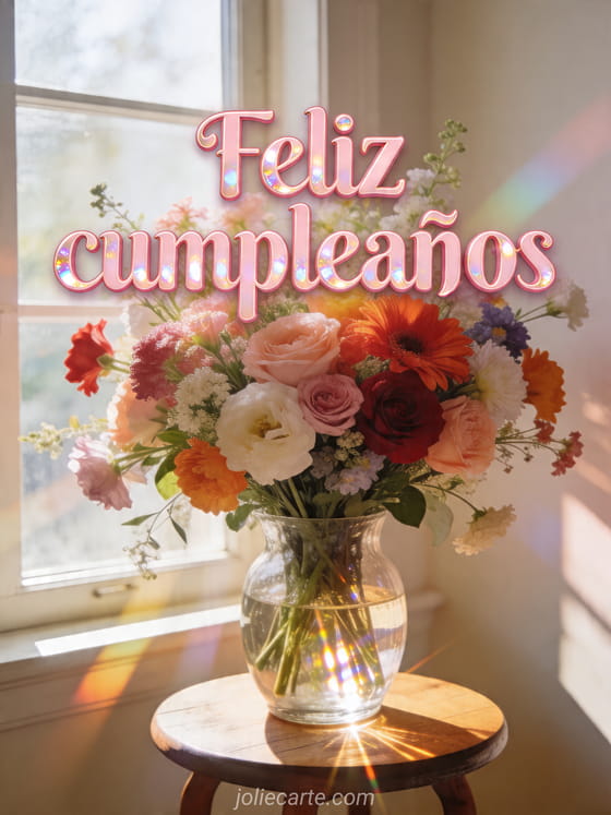 Comparte un suave feliz cumpleaños con esta tarjeta fotorrealista que muestra un gran ramo de flores variadas en un jarrón de vidrio iluminado por el sol. También puedes descubrir gif gratis cumpleaños mujer humor, foto cumpleaños mujer o cumpleaños mujer humorístico.