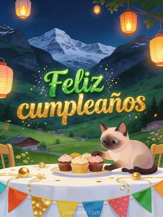 Celebren con esta tarjeta cumpleaños niño gratis con un gato siamés tierno en una mesa festiva con cupcakes, guirnalda de colores, faroles y un valle alpino luminoso al fondo. También pueden descubrir pancarta feliz cumpleaños bebé, feliz cumpleaños bebé gif y tarjeta feliz cumpleaños bebé.