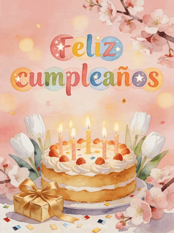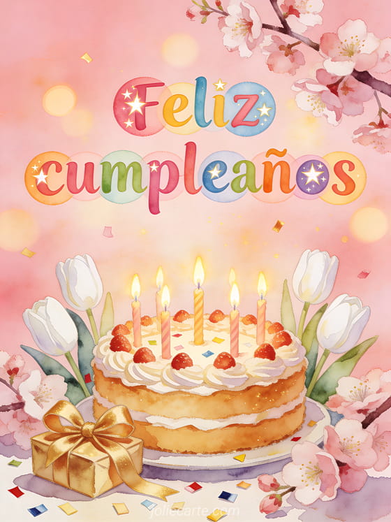 Envíen un mensaje de cumpleaños lleno de color con esta tarjeta festiva de pastel y flores. También pueden ver tarjeta cumpleaños niña gratis, mensaje texto cumpleaños niño o linda tarjeta virtual cumpleaños niño.