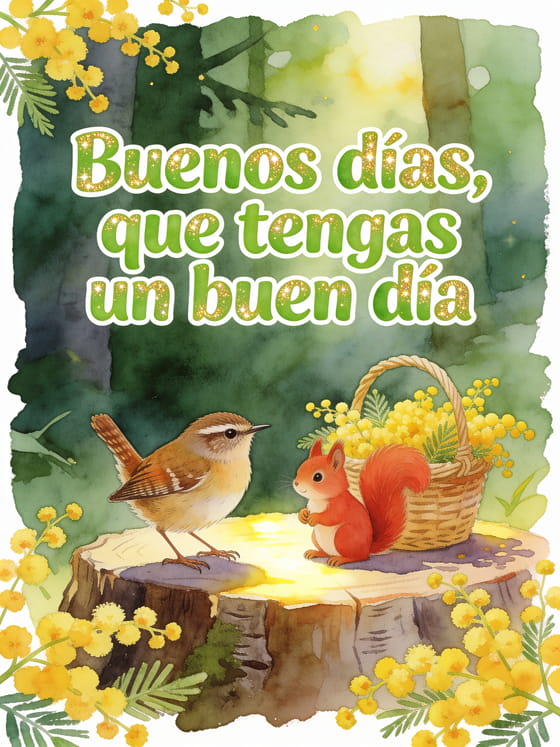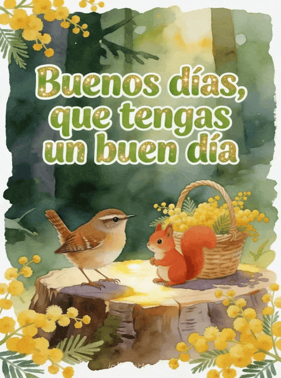 Envía una tarjeta de buenos días animales con una escena alegre de bosque, un pequeño chochín, una ardilla roja y mimosa soleada para empezar bien. También pueden compartir un mensaje de buenos días conmovedor, un buenos días gif gracioso o un mensaje de buenos días amistoso.