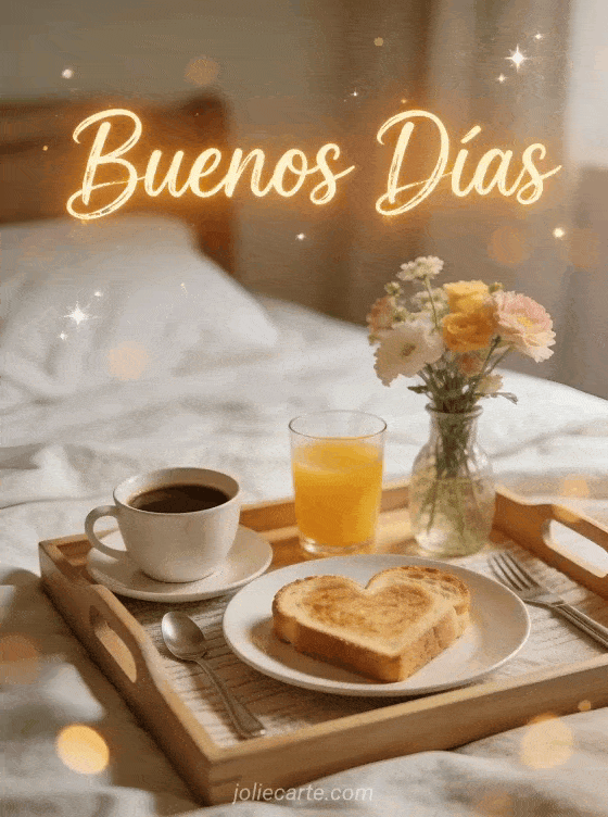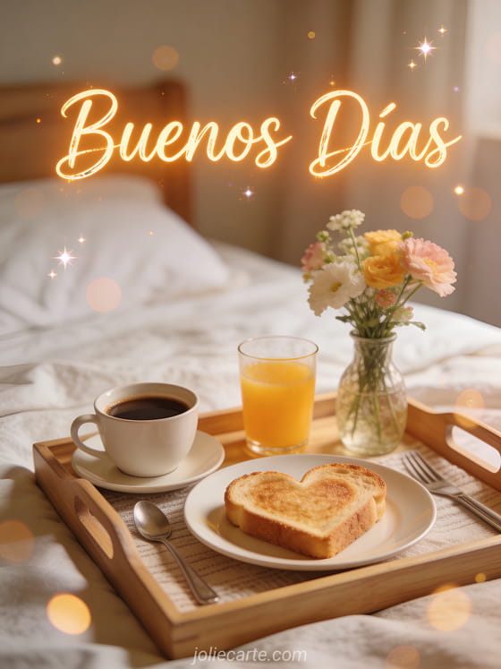 Empieza el día con amor con esta encantadora tarjeta de buenos días que presenta una bandeja de desayuno con tostada en forma de corazón, café y jugo de naranja fresco, un pequeño jarrón con flores primaverales en un romántico desayuno en la cama. Descubre también un buenos días tierno o una cita de buenos días.