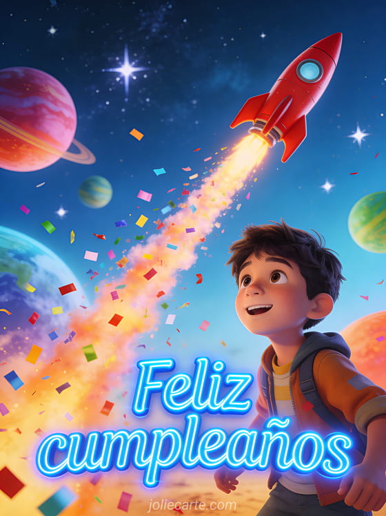 Celebra un cumpleaños con esta dinámica tarjeta animada con un cohete rojo despegando en un cielo estrellado con una estela de confeti multicolor, planetas coloridos de fondo y estrellas centelleantes. Descubre también una tarjeta virtual animada de feliz cumpleaños o una tarjeta animada de cumpleaños con perro.