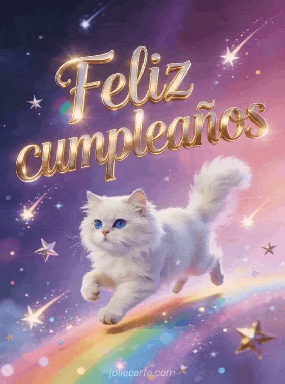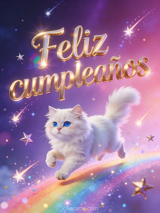 Comparte un saludo encantado de cumpleaños con letras doradas, un gato persa blanco de ojos azules galopando sobre un arcoíris, estrellas fugaces, purpurina mágica y un fondo luminoso violeta y rosa. También puedes descubrir un texto humorístico cumpleaños niño, una tarjeta cumpleaños musical niño o una tarjeta para hacer tarjeta cumpleaños niño.